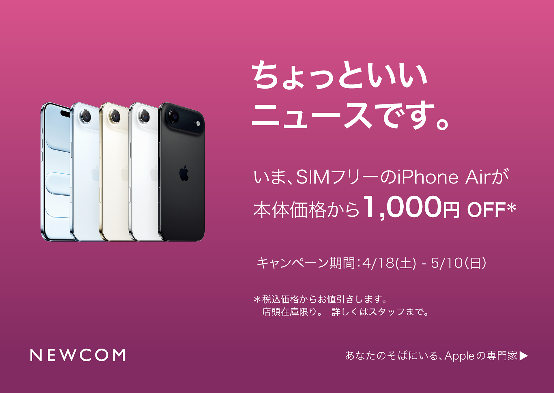 NEWCOMでは期間限定で、SIMフリーのiPhone Airが本体価格から1,000円 OFF* になるキャンペーンを実施します。